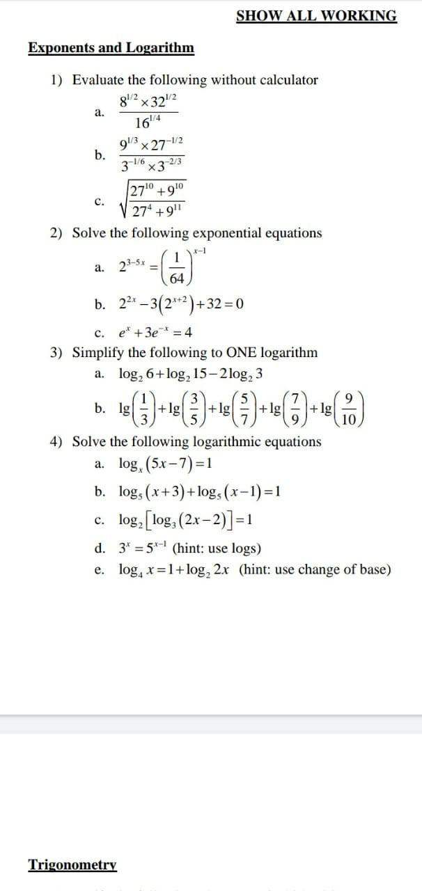 Solved Show All Working Exponents And Logarithm 1 Evaluate Chegg Com